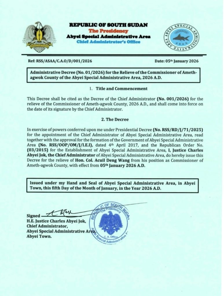 The Chief Administrator of the Abyei Special Administrative Area, H.E. Justice Charles Abyei Jok, issues an administrative decree (No. 01/2026) for the relieve of the Commissioner of Ameth-agwok County, for Abyei Special Administrative Area.2026.AD.