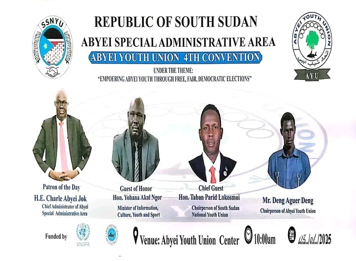 Hon.Yohana Akol Ngor, the Minister of Information, Culture, Youth and Sport, and representative of the Chief Administrator of the Abyei Area Administration, graced the elections of the Abyei Youth Union, which commenced on Saturday, January 3, 2026. In attendance at this esteemed occasion were the Hon. Biong Mathok Aguek, Minister of Education, and the Hon.Dier Nyok Pajol, Deputy Mayor of the Abyei City Municipality. Furthermore, a distinguished delegation from the National Youth Union was led by Mr. Motwakil Wol Amour, Deputy Chairman of the South Sudan National Youth Union.
